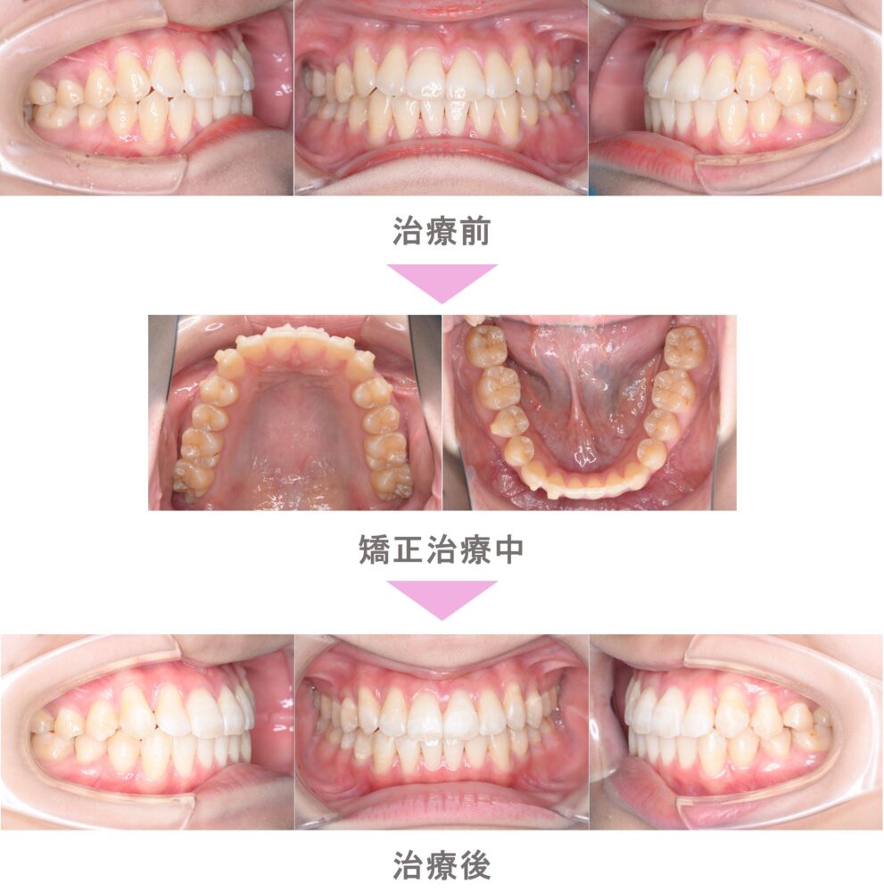 インビザライン矯正(マウスピース矯正)の症例紹介|叢生(前歯のでこぼこ)と出っ歯(上顎前突)の症状|非抜歯による再矯正治療(後戻り・失敗)|治療期間は1年7か月(東京都世田谷区・30代女性 )