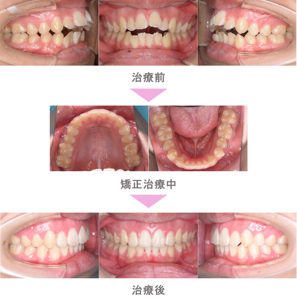 インビザライン矯正(マウスピース矯正)の症例のご紹介です。この患者様は、東京都世田谷区内からご来院の30代女性で、叢生(前歯のでこぼこ)と出っ歯(上顎前突)の症状がありました。治療法はインビザライン矯正。非抜歯で矯正治療を行い、キレイな歯並びになりました。治療期間は1年7か月です。