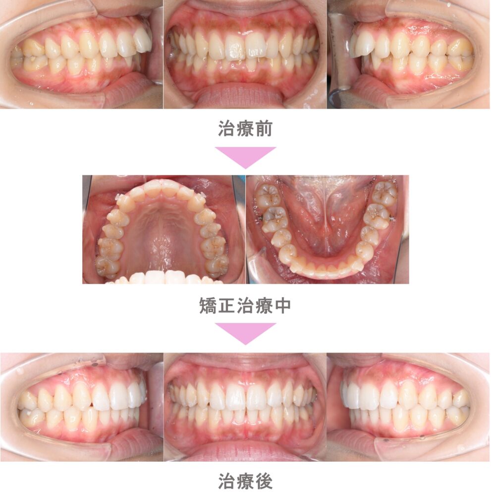 インビザライン矯正(マウスピース矯正)の症例紹介|叢生(前歯のでこぼこ)と出っ歯(上顎前突)と上下顎前突(口ゴボ)の症状|抜歯による矯正治療|治療期間は2年8か月(東京都武蔵野市・大学生女性 )