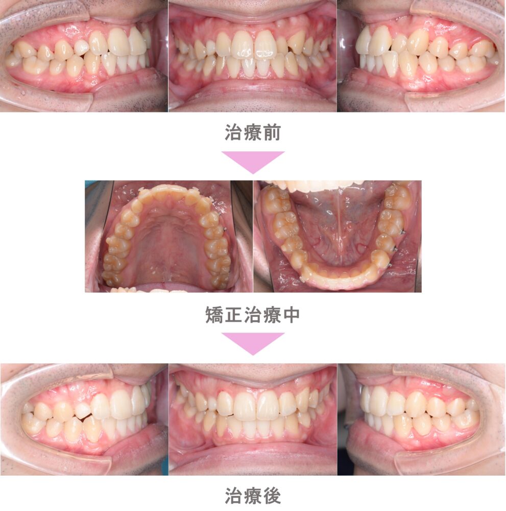 インビザライン矯正(マウスピース矯正)の症例のご紹介です。この患者様は、東京都武蔵野市からご来院の30代女性で、叢生(前歯のでこぼこ)と八重歯(犬歯突出)の症状がありました。治療法はインビザライン矯正。非抜歯で矯正治療を行い、キレイな歯並びになりました。治療期間は2年2か月です。