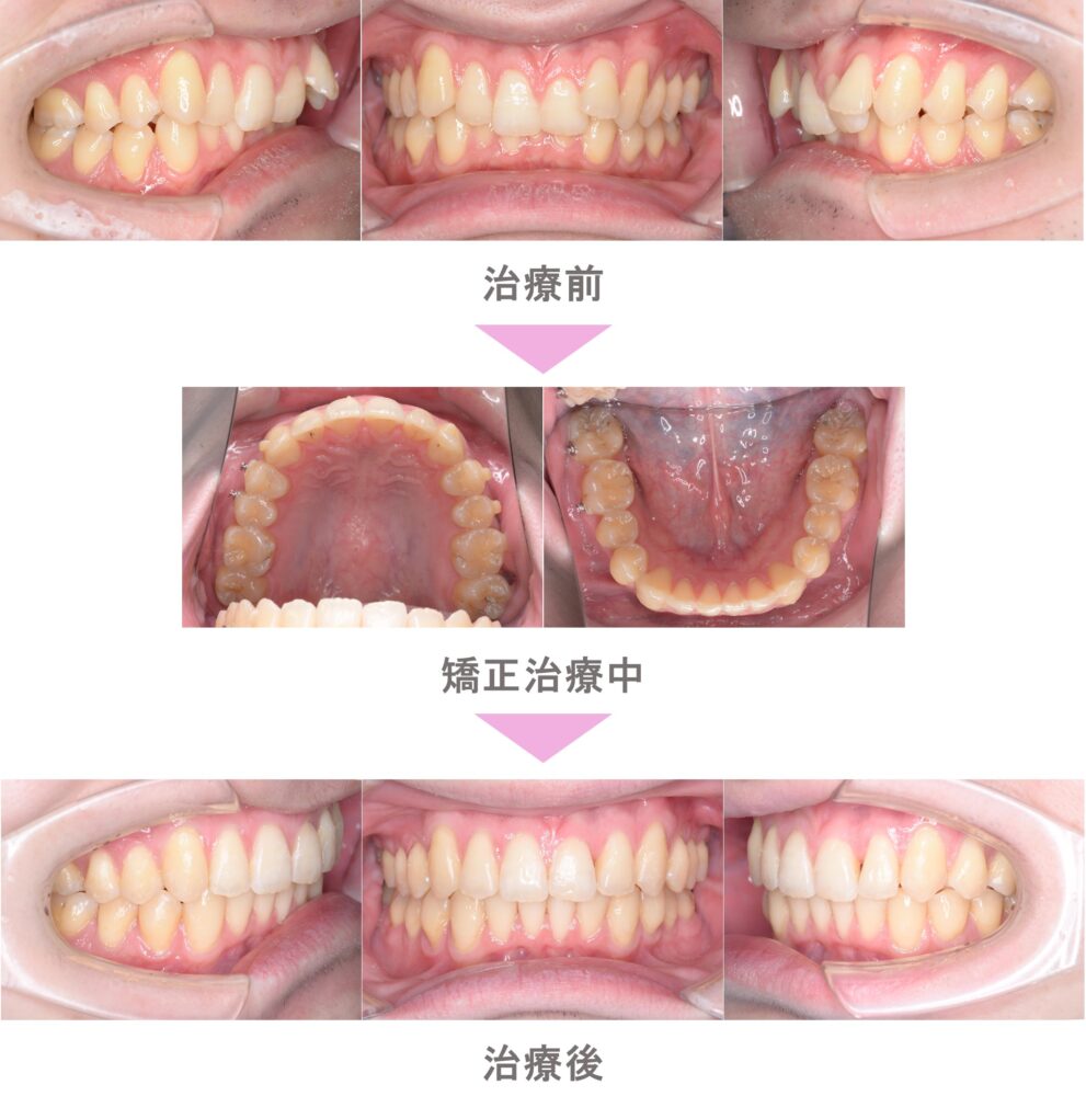 インビザライン矯正(マウスピース矯正)の症例紹介|叢生(前歯のでこぼこ)と八重歯(犬歯突出)の症状|非抜歯による矯正治療|治療期間は1年6か月(東京都目黒区・30代女性 )