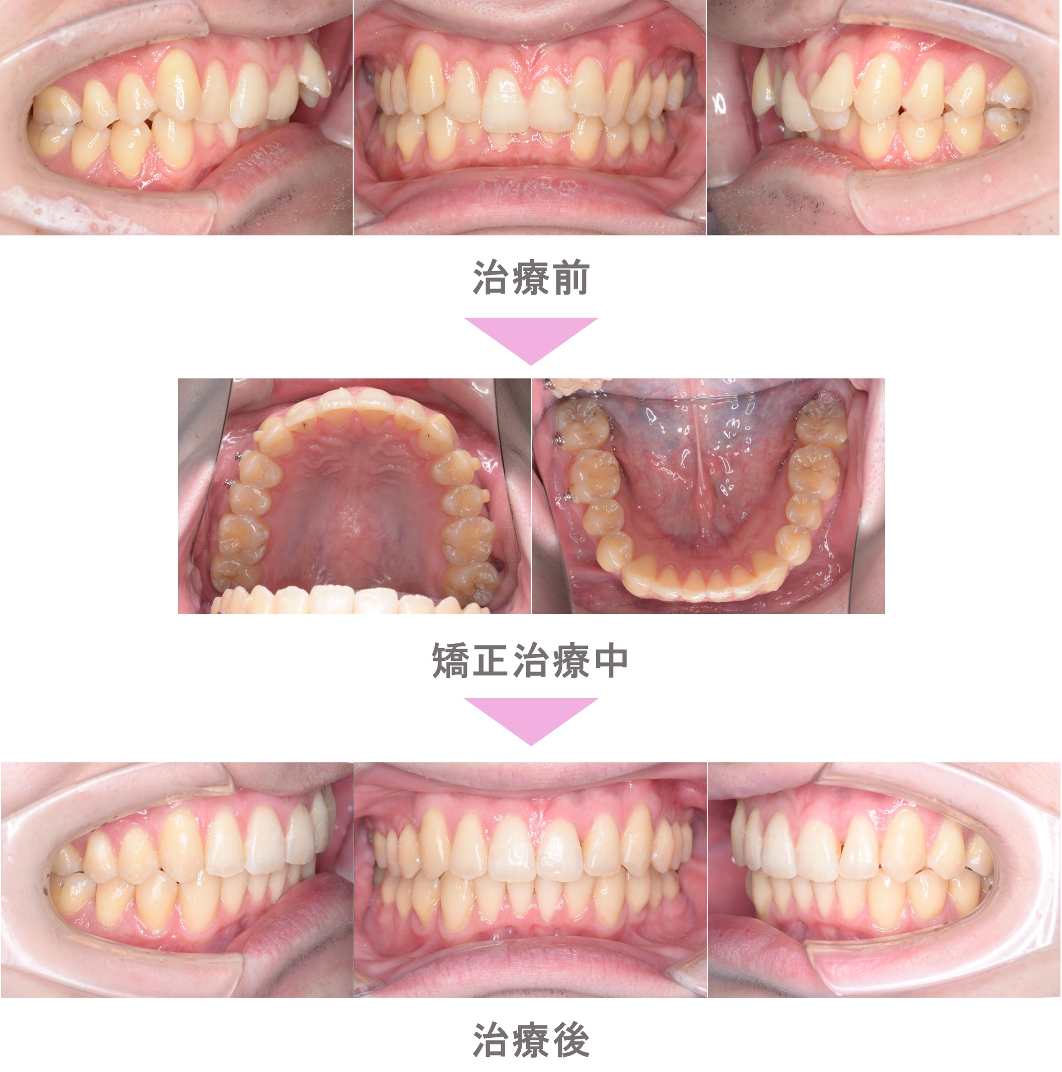 インビザライン矯正(マウスピース矯正)の症例紹介|過蓋咬合(深噛み)と八重歯(犬歯突出)と叢生(前歯のでこぼこ)の症状|非抜歯による矯正治療|治療期間は2年2か月(東京都品川区・20代男性 )