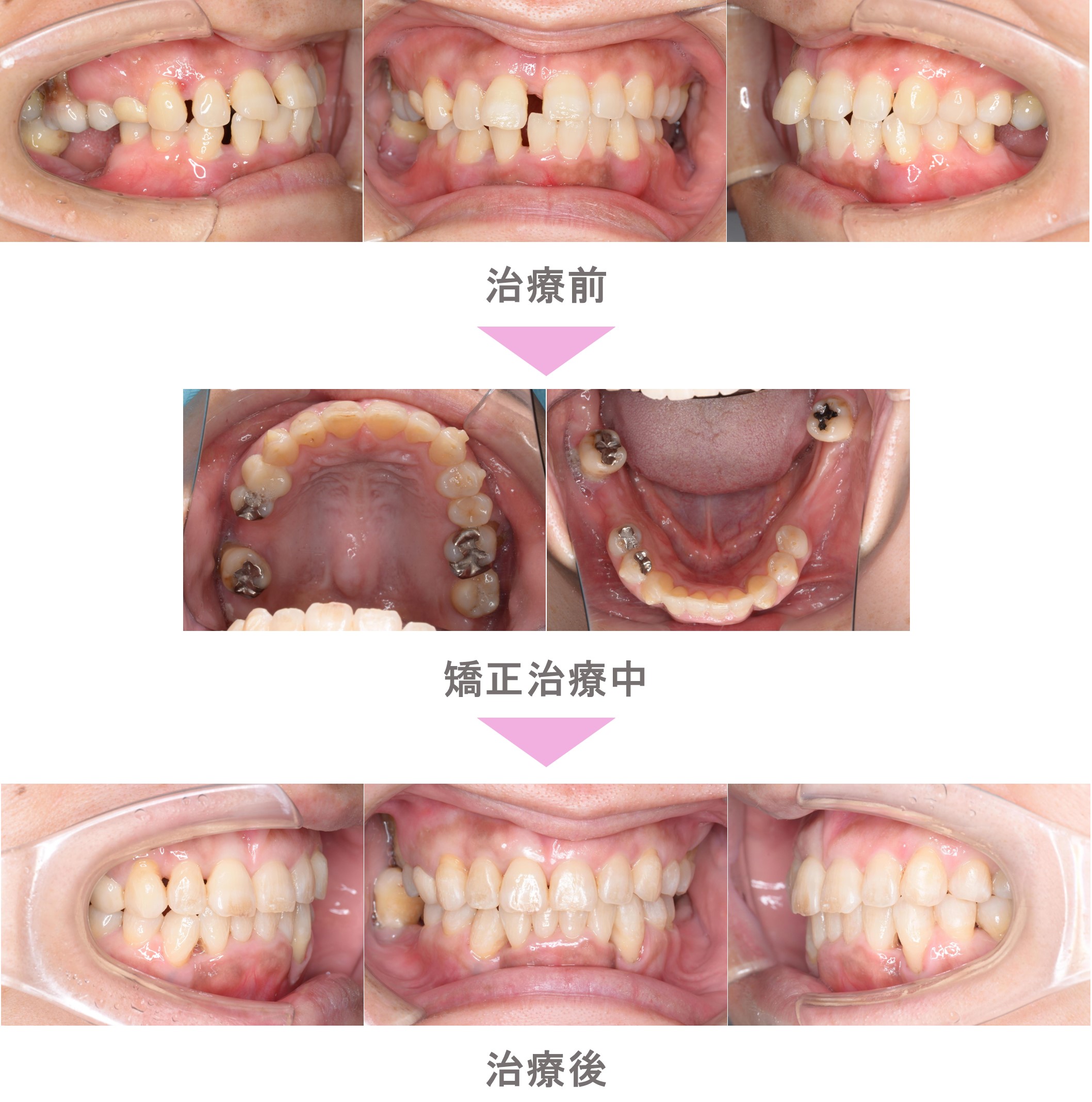 インビザライン矯正(マウスピース矯正)の症例のご紹介です。この患者様は、埼玉県越谷市からご来院の50代女性で、すきっ歯(空隙歯列)と叢生(前歯のでこぼこ)の症状がありました。治療法はインビザライン矯正。非抜歯で矯正治療を行い、キレイな歯並びになりました。