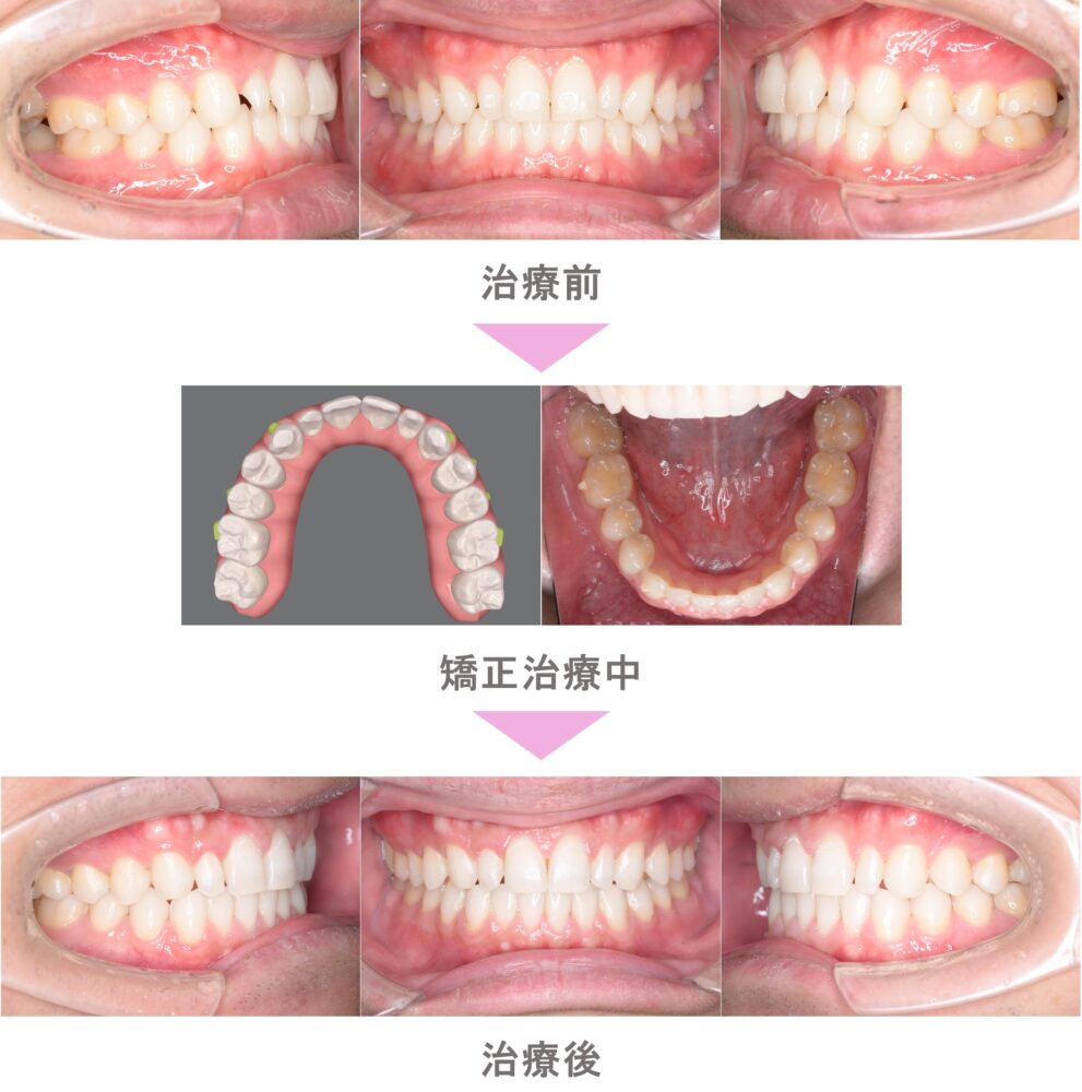 インビザライン矯正(マウスピース矯正)の症例紹介|すきっ歯(空隙歯列)と叢生(前歯のでこぼこ)の症状|非抜歯による矯正治療|治療期間は11か月(埼玉県越谷市・50代女性 )