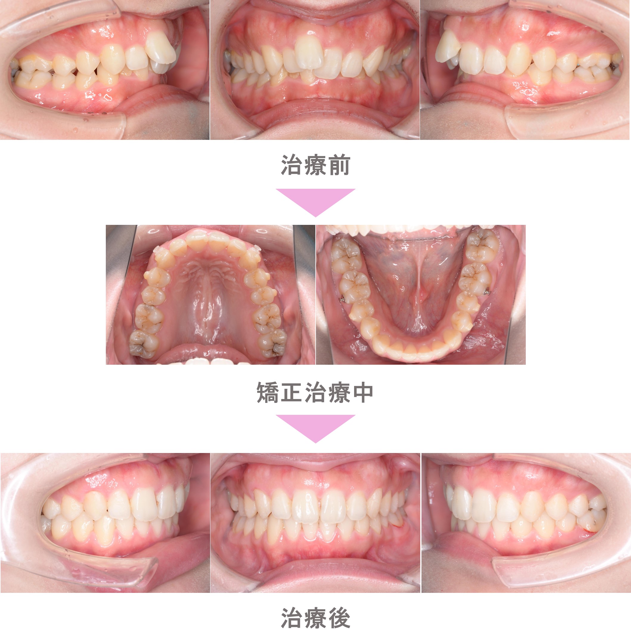 インビザライン矯正(マウスピース矯正)の症例のご紹介です。この患者様は、神奈川県横浜市からご来院の20代女性で、叢生(前歯のでこぼこ)と出っ歯(上顎前突)と過蓋咬合(深噛み)の症状がありました。治療法はインビザライン矯正。非抜歯で矯正治療を行い、キレイな歯並びになりました。