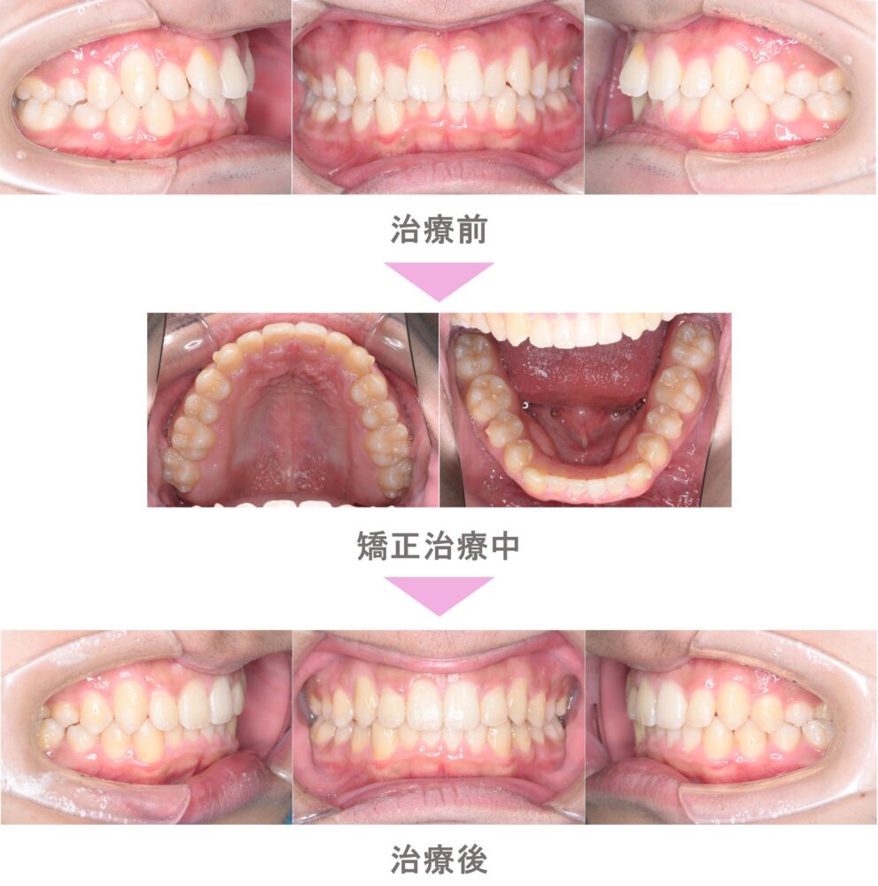 インビザライン矯正(マウスピース矯正)の症例のご紹介です。この患者様は、神奈川県横浜市からご来院の20代女性で、出っ歯(上顎前突)と八重歯(犬歯突出)と叢生(前歯のでこぼこ)の症状がありました。治療法はインビザライン矯正。非抜歯で矯正治療を行い、キレイな歯並びになりました。