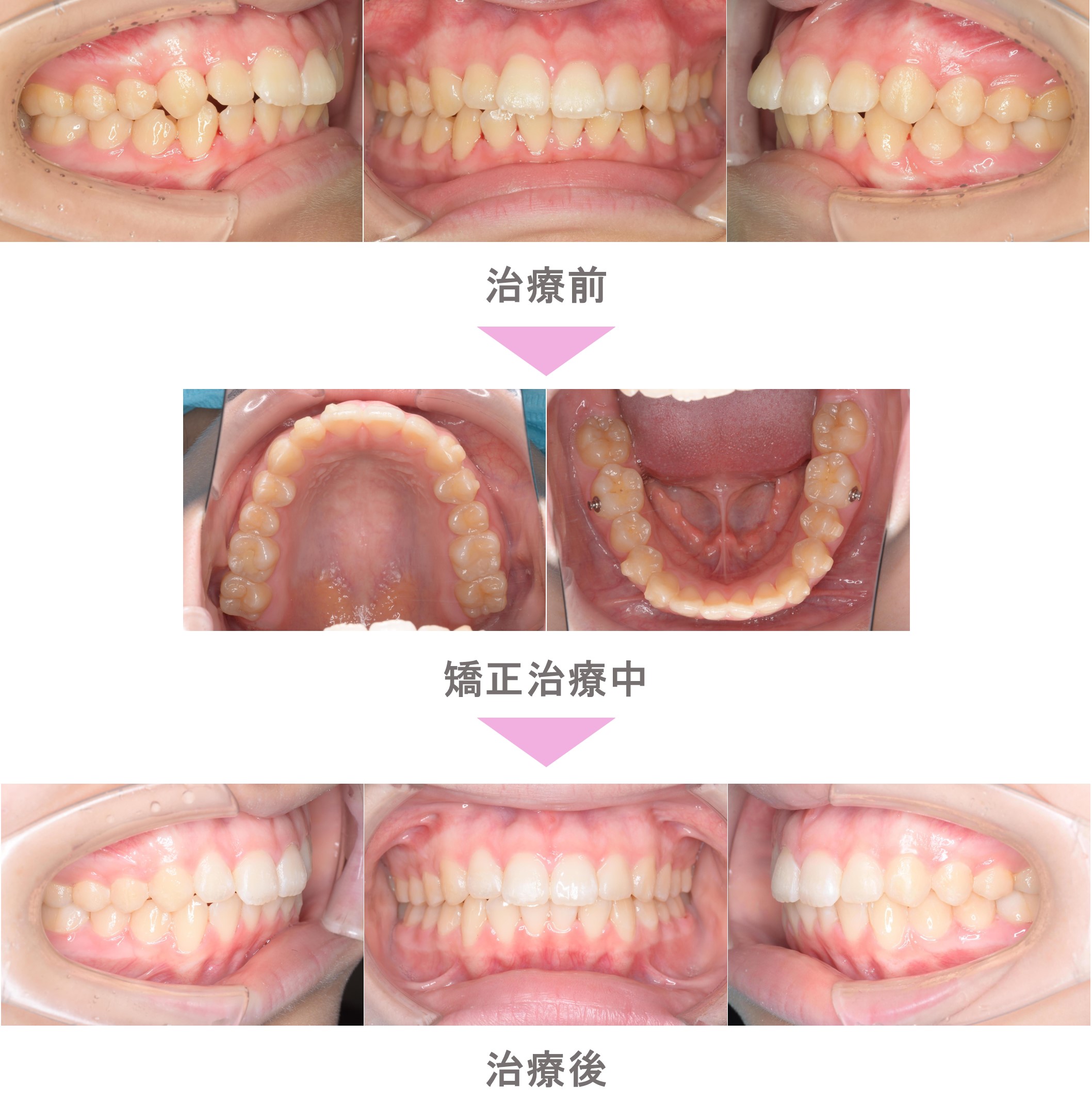 インビザライン矯正(マウスピース矯正)の症例のご紹介です。この患者様は、東京都目黒区からご来院の中学生女子で、出っ歯(上顎前突)と上下顎前突(口ゴボ)と叢生(前歯のでこぼこ)の症状がありました。治療法はインビザライン矯正。非抜歯で矯正治療を行い、キレイな歯並びになりました。治療期間は1年7か月です。