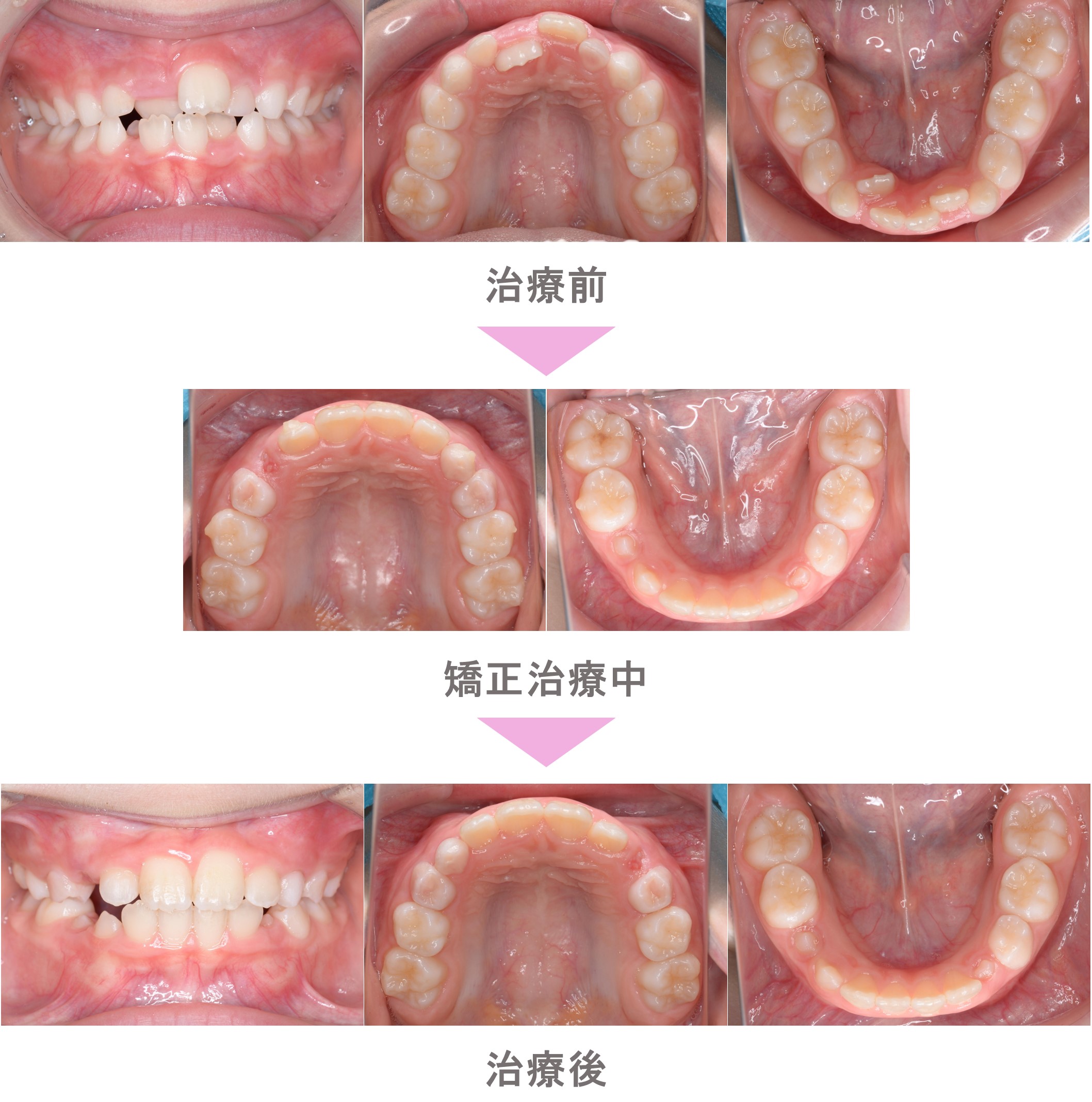 インビザラインファースト(小児矯正)の症例のご紹介です。この患者様は、東京都目黒区からご来院の小学生女子で、受け口(反対咬合)と出っ歯(上顎前突)の症状がありました。治療法はインビザラインファーストで、治療期間は1年4か月です。前歯部反対咬合と叢生の改善、上下歯列の拡大を行い萌出スペースを確保しました。第二大臼歯萌出後、歯列が崩れた場合は、二期治療が必要になります。