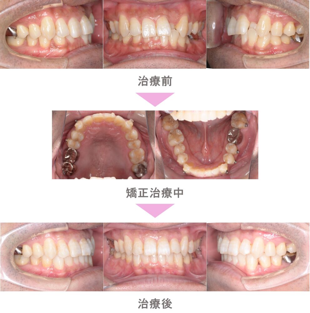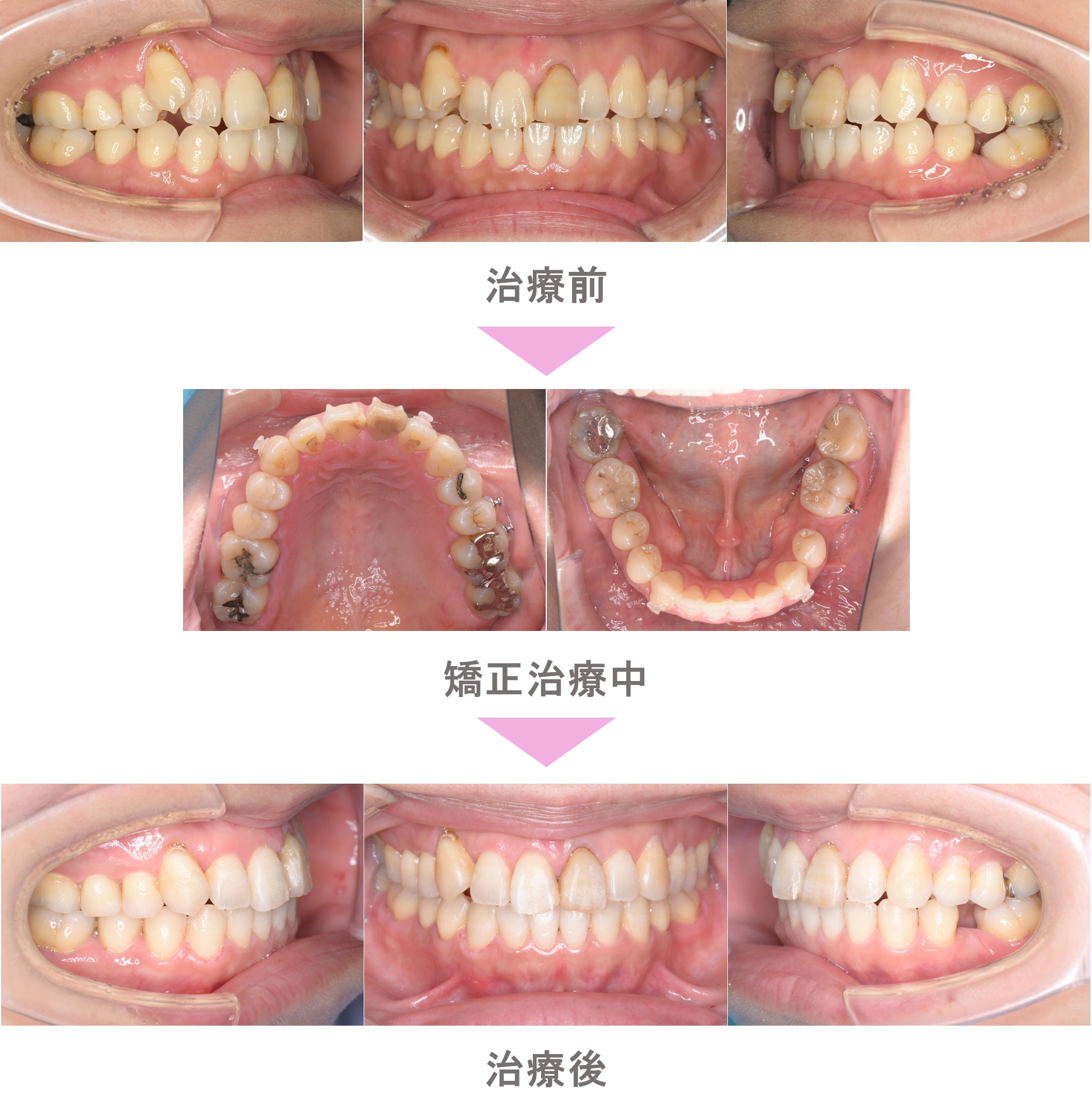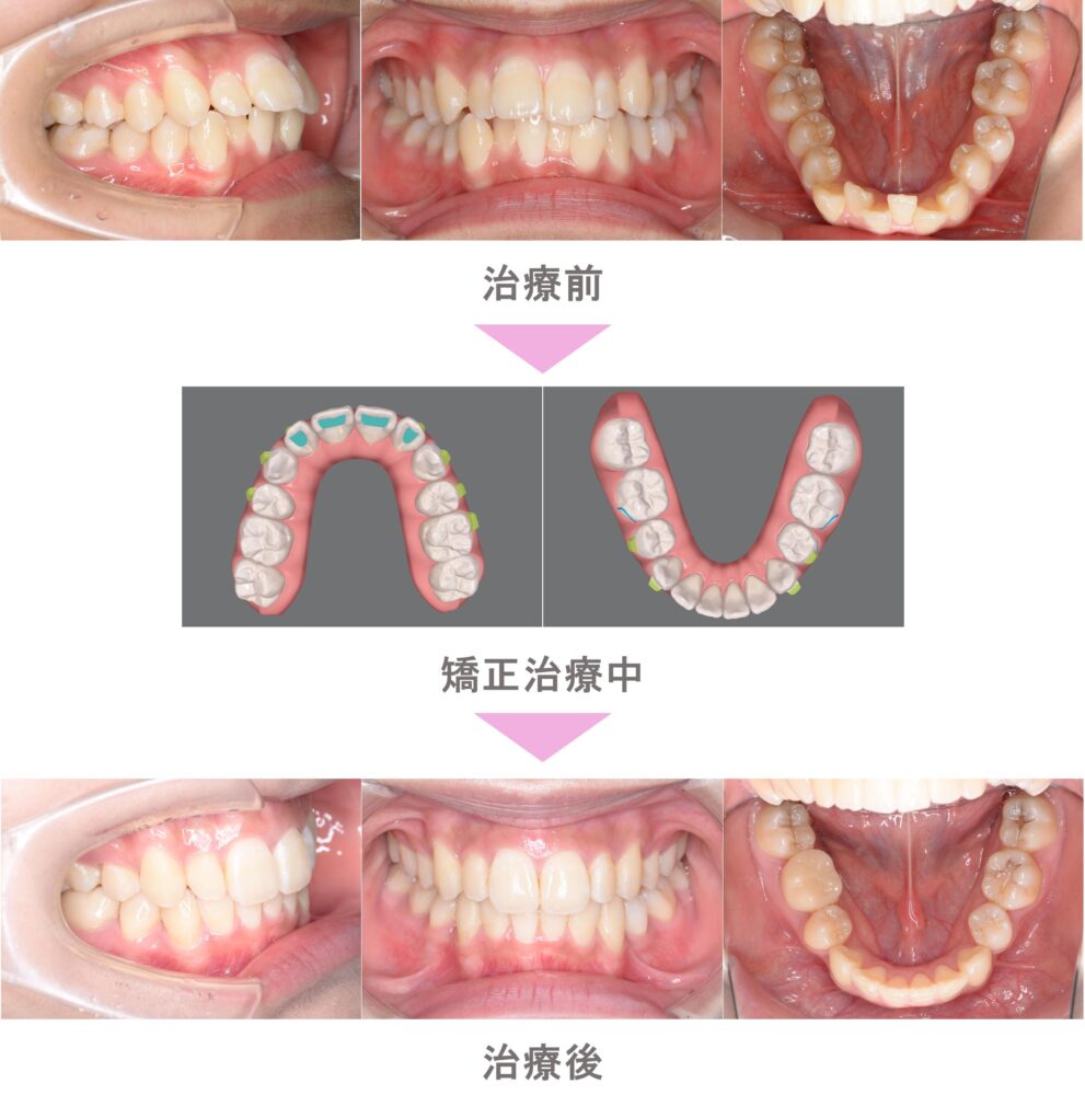 インビザライン矯正(マウスピース矯正)の症例のご紹介です。この患者様は、東京都世田谷区内からご来院の40代女性で、正中のずれ(正中偏位)と八重歯(犬歯突出)と叢生(前歯のでこぼこ)の症状がありました。治療法はインビザライン矯正。非抜歯で矯正治療を行い、キレイな歯並びになりました。治療期間は1年4か月です。