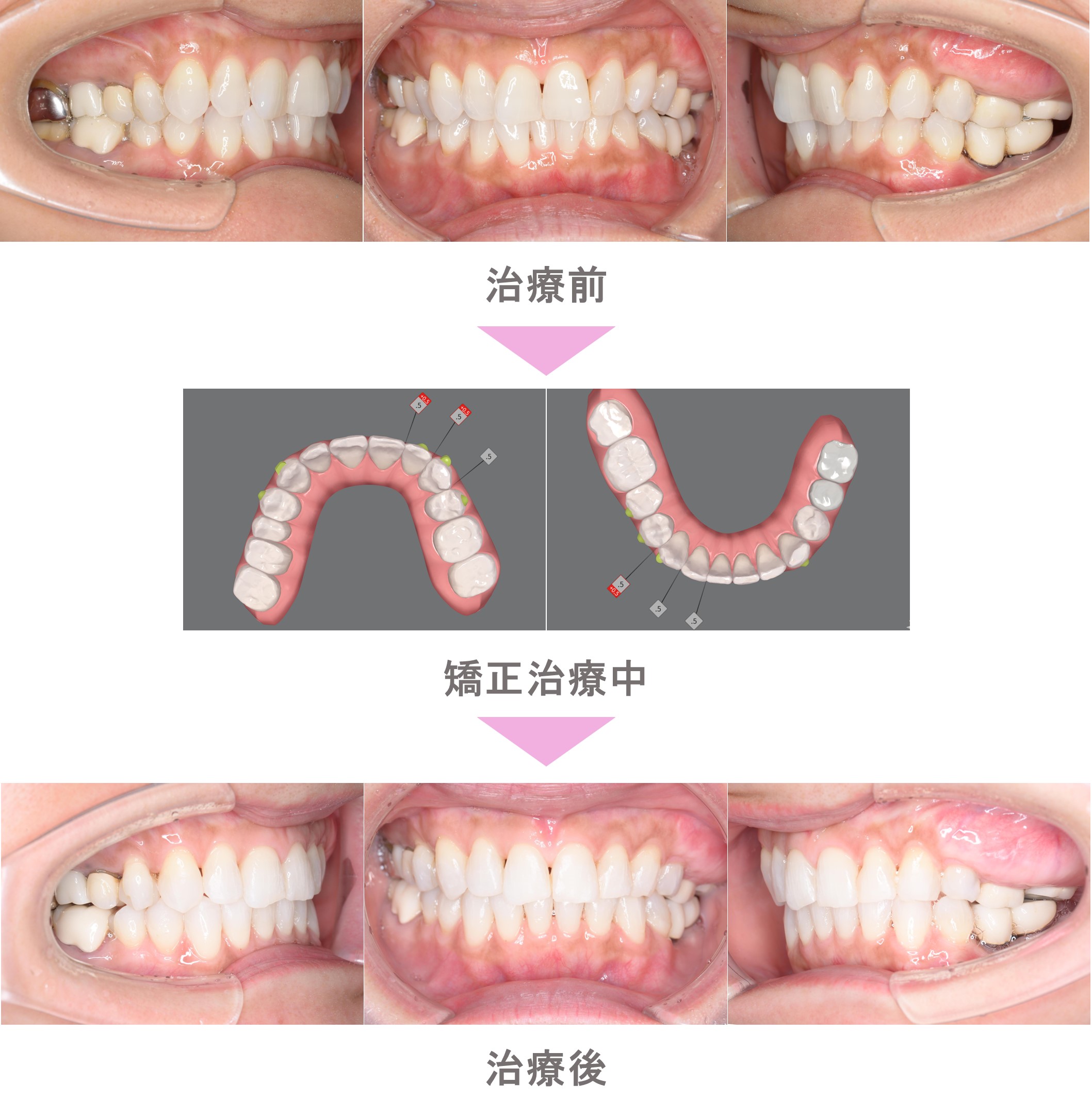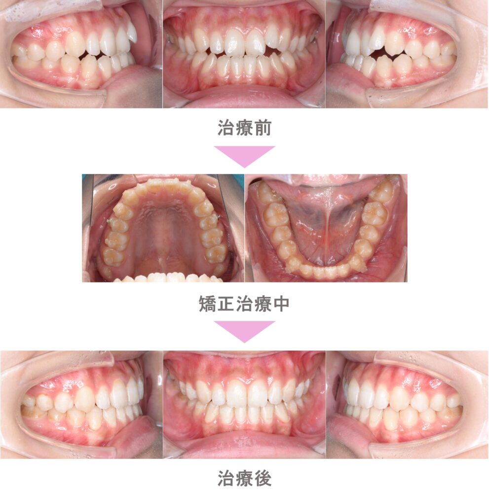 インビザライン矯正(マウスピース矯正)の症例紹介|叢生(前歯のでこぼこ)と成人の正中のずれ(前歯の中心のずれ)の症状|非抜歯による矯正治療(東京都町田市・40代女性 )