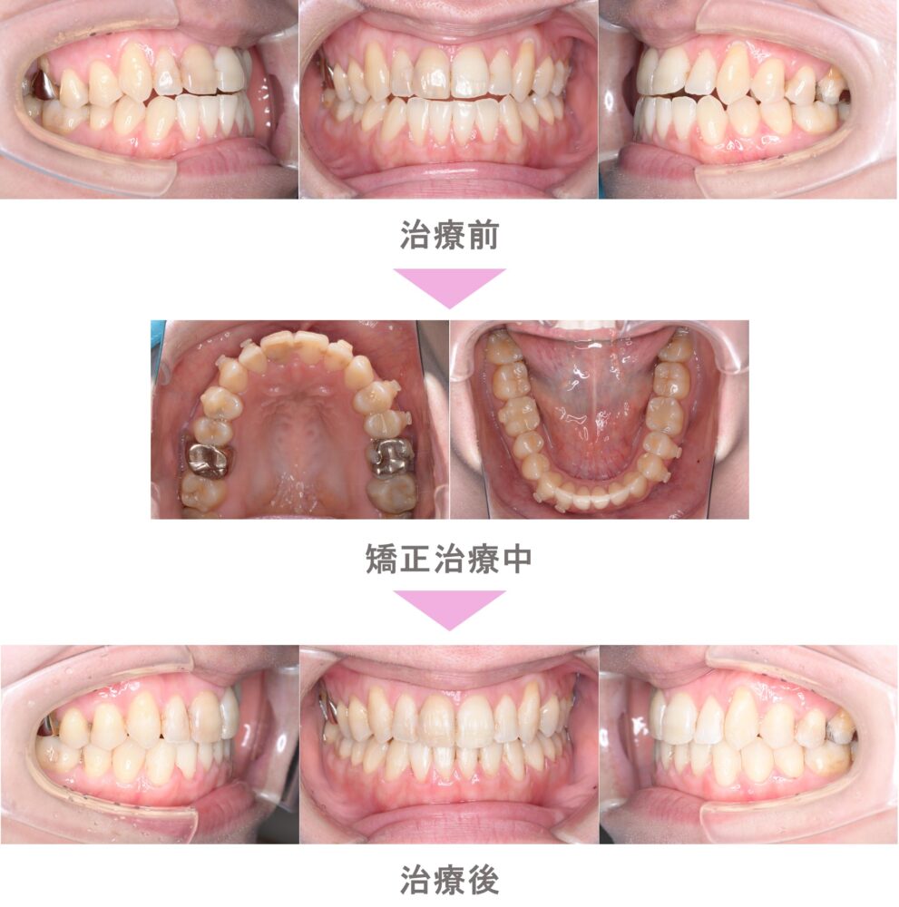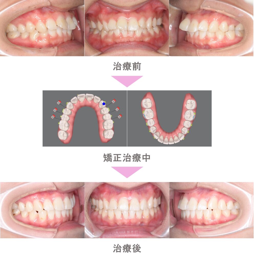 インビザラインファースト(小児矯正)の症例のご紹介です。この患者様は、東京都世田谷区からご来院の小学生男子で、受け口(反対咬合)と叢生(前歯のでこぼこ)と萌出スペース不足の症状がありました。治療法はインビザラインファーストで、治療期間は1年3か月です。上下歯列の拡大を行い、前歯部反対咬合の改善と永久歯萌出スペースの確保しました。第二大臼歯萌出後、歯列が崩れた場合は、二期治療が必要になります。