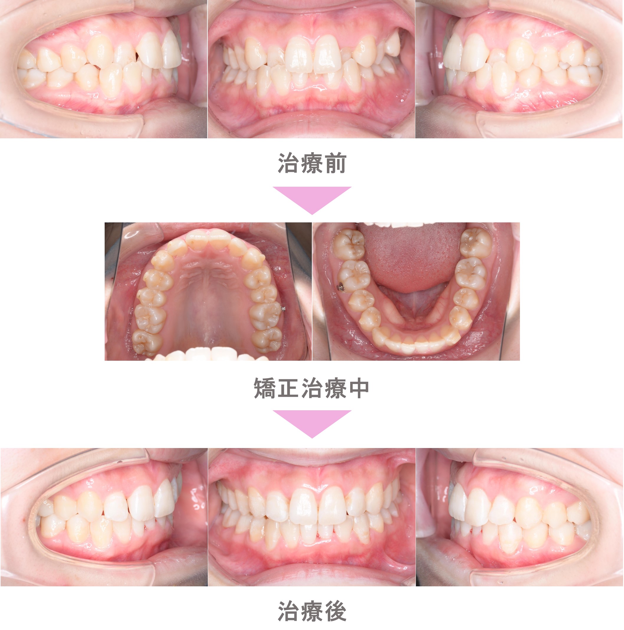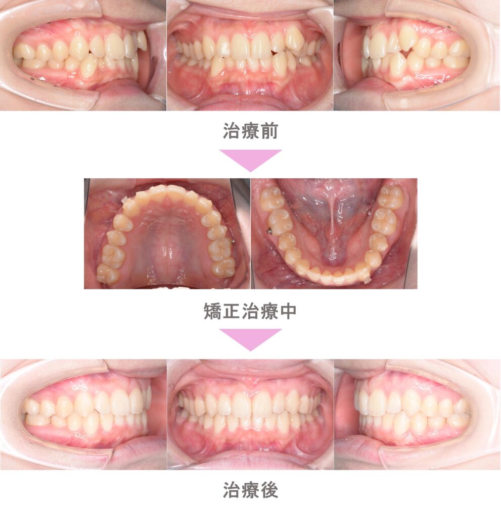 インビザライン矯正(マウスピース矯正)の症例のご紹介です。この患者様は、東京都墨田区からご来院の20代女性で、叢生(前歯のでこぼこ)と過蓋咬合(深噛み)と交叉咬合(すれ違い)の症状がありました。治療法はインビザライン矯正。非抜歯で矯正治療を行い、キレイな歯並びになりました。治療期間は7か月です。