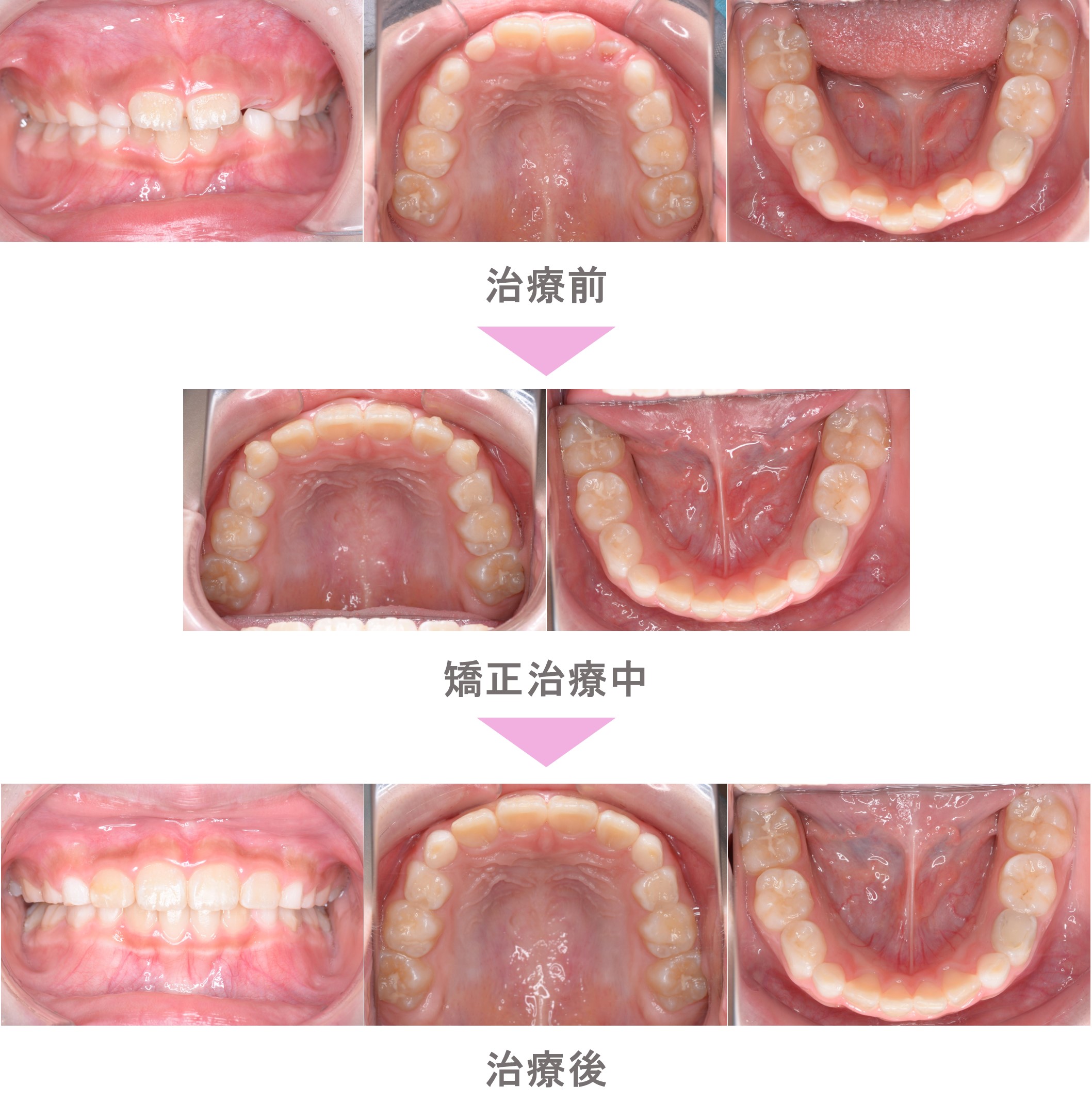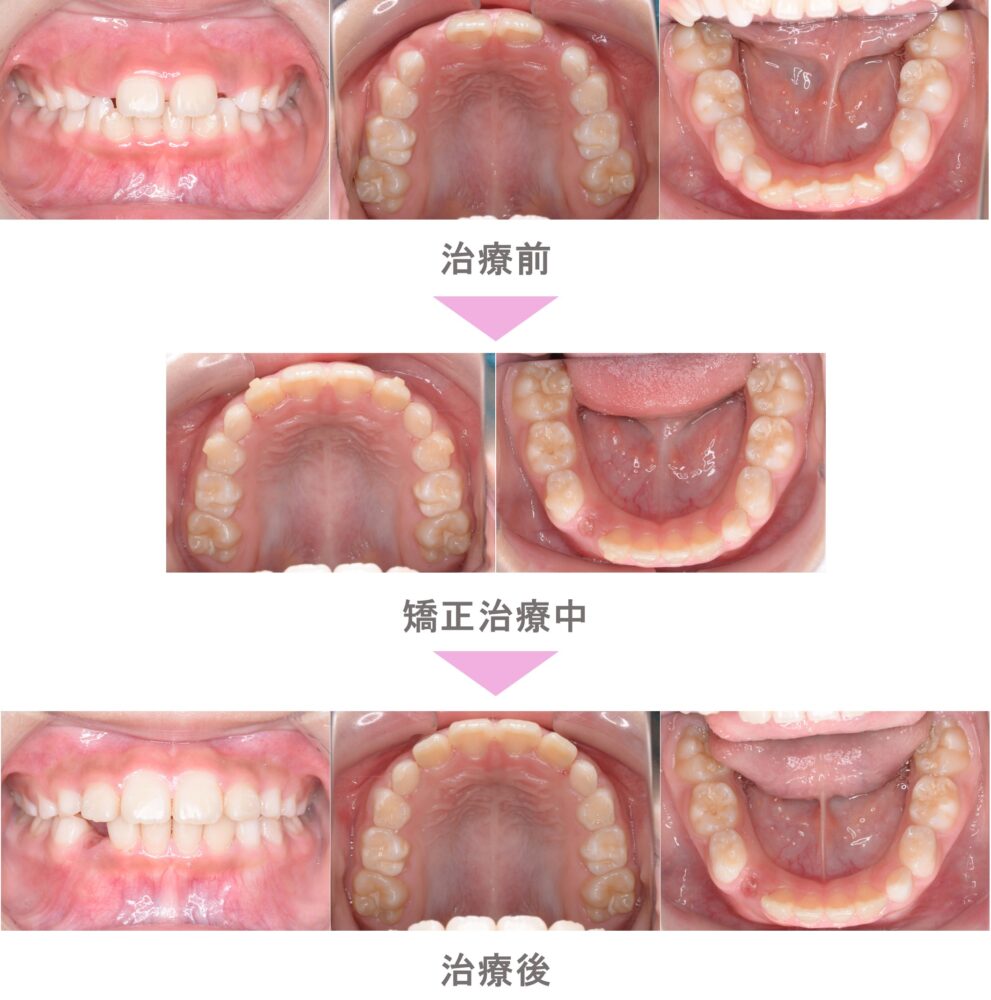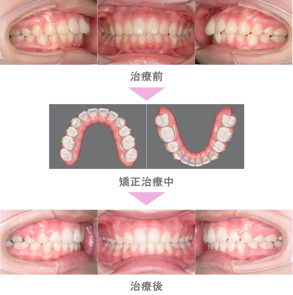 インビザラインファースト(マウスピース小児矯正)の症例紹介|叢生(前歯のでこぼこ)と出っ歯(上顎前突)と萌出スペース不足の症状|非抜歯による矯正治療|治療期間は9か月(東京都世田谷区・小学生女子)