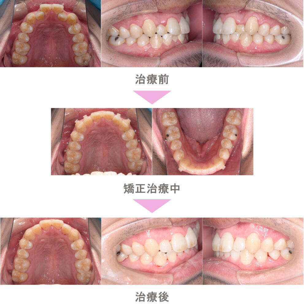 インビザライン矯正(マウスピース矯正)の症例紹介|叢生(前歯のでこぼこ)と八重歯(犬歯突出)と出っ歯(上顎前突)の症状|非抜歯による矯正治療|治療期間は1年11か月(東京都目黒区・20代男性)