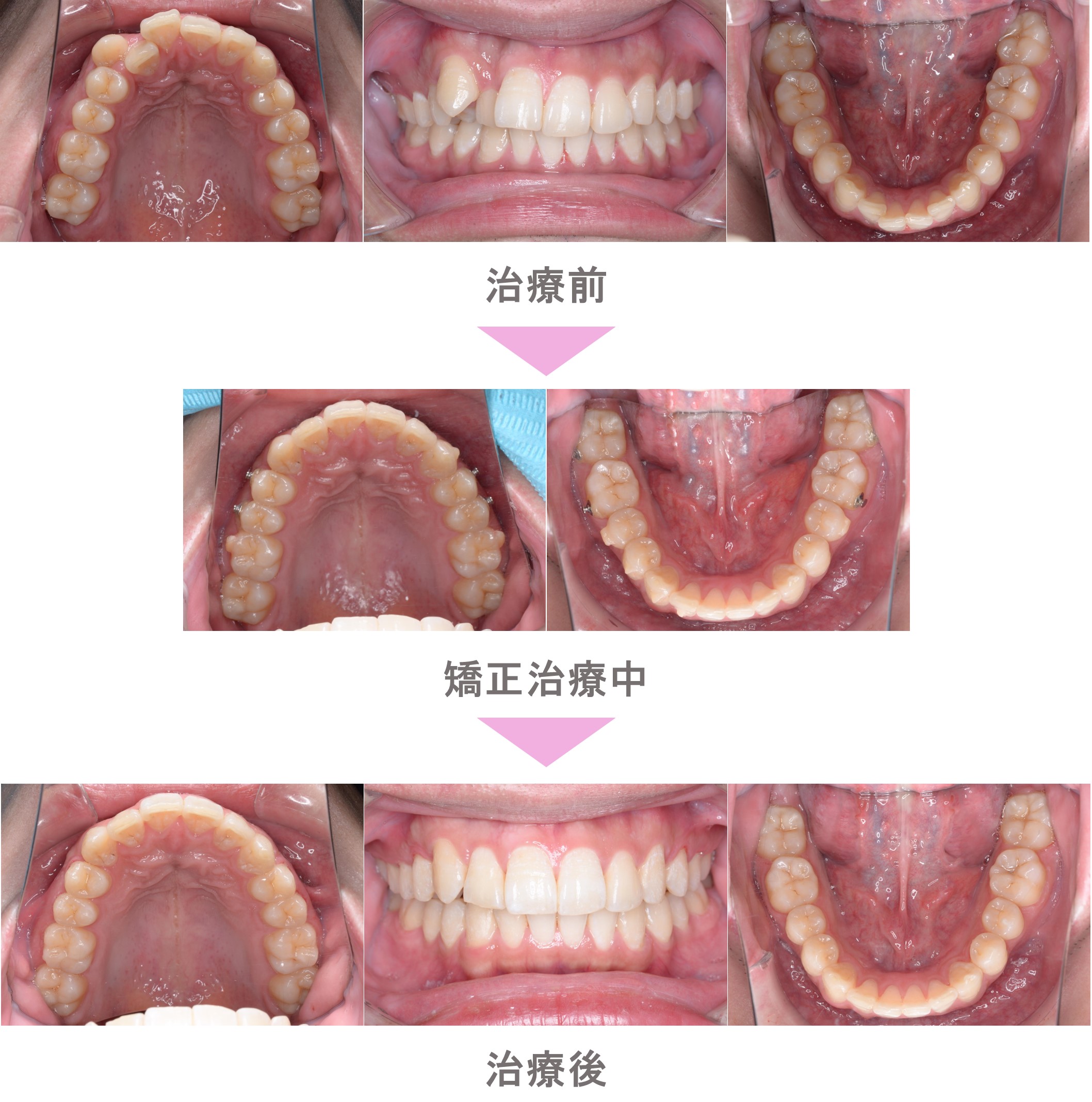 インビザライン矯正(マウスピース矯正)の症例のご紹介です。この患者様は、東京都目黒区からご来院の20代男性で、叢生(前歯のでこぼこ)と八重歯(犬歯突出)と出っ歯(上顎前突)の症状がありました。治療法はインビザライン矯正。非抜歯で矯正治療を行い、キレイな歯並びになりました。治療期間は1年11か月です。