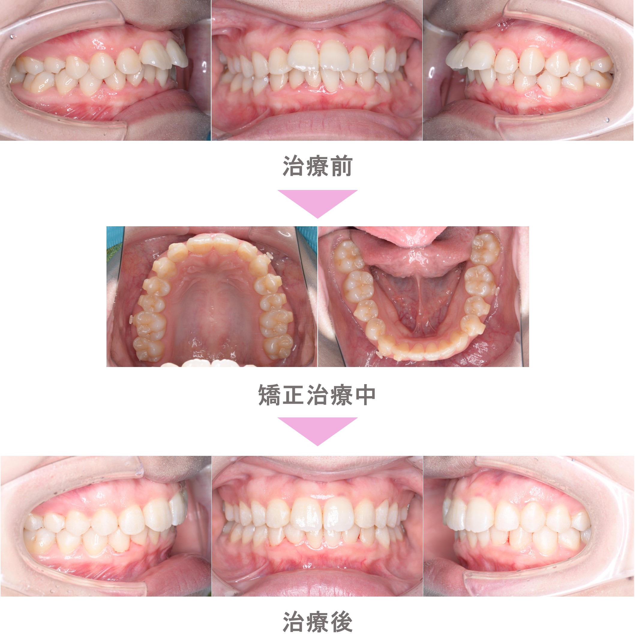 インビザライン矯正(マウスピース矯正)の症例のご紹介です。この患者様は、神奈川県川崎市からご来院の20代女性で、出っ歯(上顎前突)と上下顎前突(口ゴボ)と叢生(前歯のでこぼこ)の症状がありました。治療法はインビザライン矯正。非抜歯で矯正治療を行い、キレイな歯並びになりました。治療期間は10か月です。