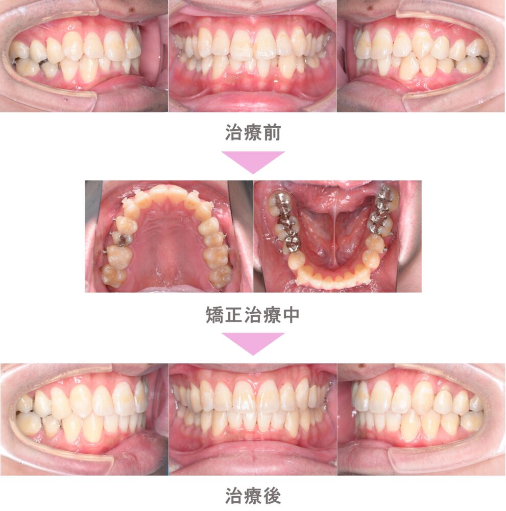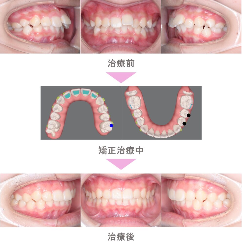 インビザライン矯正(マウスピース矯正)の症例のご紹介です。この患者様は、神奈川県川崎市内からご来院の20代男性で、歯のでこぼこが気になりご来院されました。叢生(前歯のでこぼこ)と八重歯(犬歯突出)と過蓋咬合(深噛み)の症状があり、治療後の歯並びをシミュレーションで事前に確認でき、かつ矯正していることが分かりにくいインビザラインにて非抜歯で治療を行いました。治療期間は1年8か月です。咬み合わせが整い、綺麗な歯並びになりました。