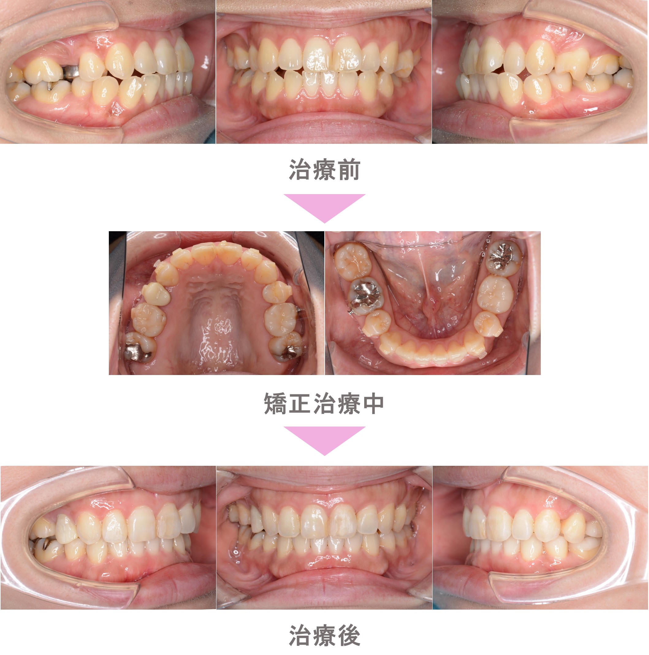 インビザライン矯正(マウスピース矯正)の症例のご紹介です。この患者様は、東京都品川区内からご来院の30代女性で、奥歯の咬み合わせと、口元が出ていることが気になりご来院されました。成人の正中のずれ(前歯の中心のずれ)と切端咬合(ぶつかる咬み合わせ)と叢生(前歯のでこぼこ)の症状があり、ワイヤー矯正より痛みの少ないインビザラインにて治療しました。治療期間は3年です。上下の咬み合わせが整い、綺麗な歯並びになりました。