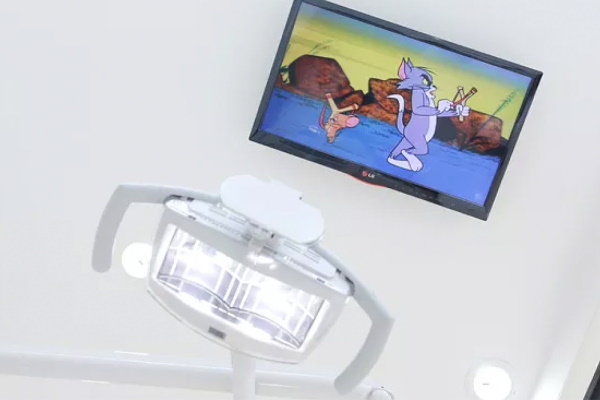 二子玉川駅前矯正歯科では、診療室の天井にもモニターを設置しており、お子さまには好きなアニメを見ながらリラックスして治療を受けていただけます。