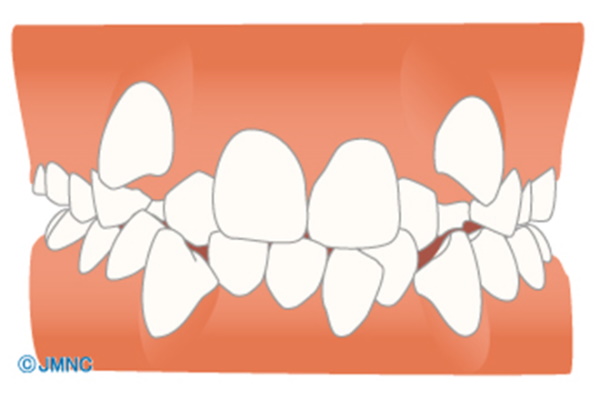歯が歯列の外側や内側に大きく飛び出したり、歯と歯が重なり合って生えたりすることで、歯列がデコボコになっている歯並びです。この歯並びの乱れは、顎に対して歯のサイズが大きく、歯がきれいに並ぶためのスペースが足りないことが原因で起こります。歯が重なりあっている部分は歯ブラシで磨きにくいため、虫歯や歯肉炎にかかりやすくなります。