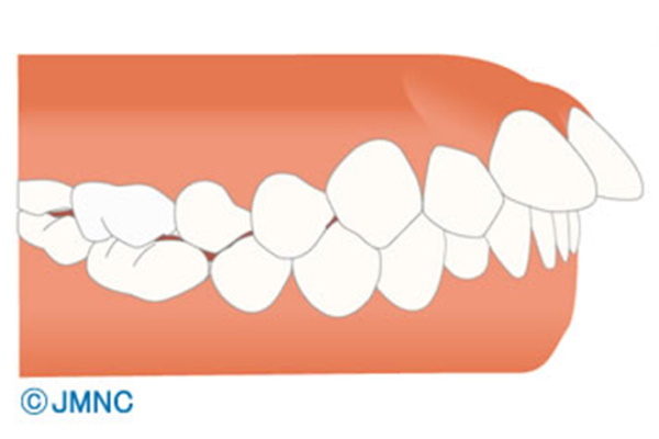 上顎の前歯や上顎の歯列全体が著しく前方に突出している歯並びです。歯が前に出ているために口を閉じにくかったり、口を閉じた状態で唇から歯が飛び出てしまったりすることがあります。お口の中が乾きやすいため、虫歯や歯肉炎になりやすいほか、「サ行」や「タ行」が発音しづらいなどの発音障害が起こりやすくなります。