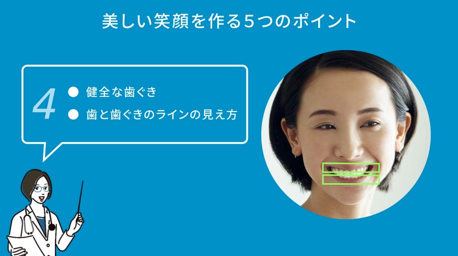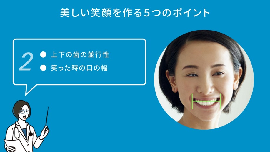 上下の歯の平行性、笑った時のお口の幅も笑顔の印象に関わってくるポイントです。