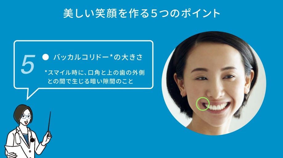 バッカルコリドーの大きさとは、スマイル時に、口角と上の歯の外側との間で生じる暗い隙間のことです。この部分が暗いか明るいかで笑顔の印象は変わってきます。