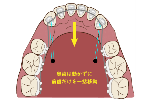 一般的なワイヤー矯正では、奥歯などの歯を固定源として、歯を動かすため、お互いに歯が引っ張り合う力がかかります。これはデメリットとなる場合がありました。