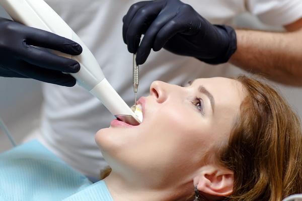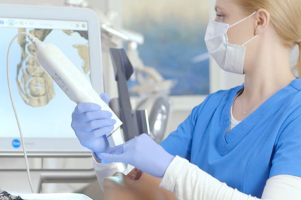 これまでのシリコン印象とは全く違い、口腔内をスキャンし、お口の中の歯並びや形状をデジタルデータで保存し、モニターに再現できる、光学スキャンによる型どり。
