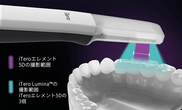 iTero Lumina 口腔内スキャナーは、先進のテクノロジーによって、iTero エレメント 5D 口腔内スキャナーの視野との比較で「3倍広い視野」で、「2倍高速のスキャン」を可能にします。