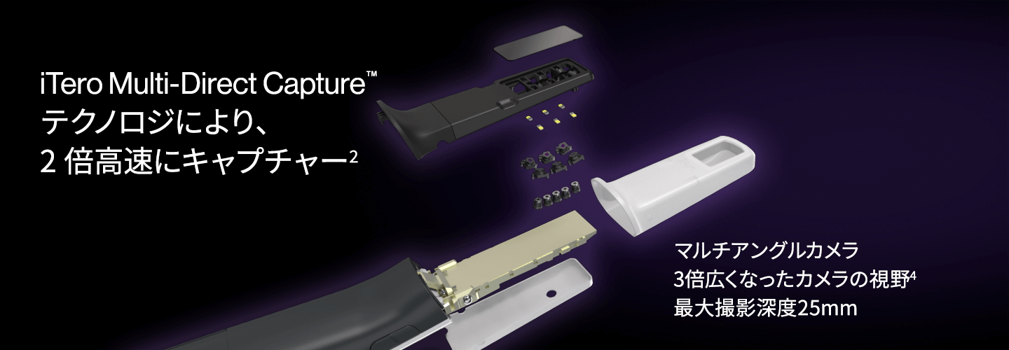 iTero Lumina に搭載されているiTero Multi-Direct Capture テクノロジーは、 iTero5Dと比較すると、3倍の視野と最大撮影深度が25mmとなり、口蓋、歯牙欠損部、部分萌出や叢生などの難しい条件でもスキャンが採得しやすくなりました。