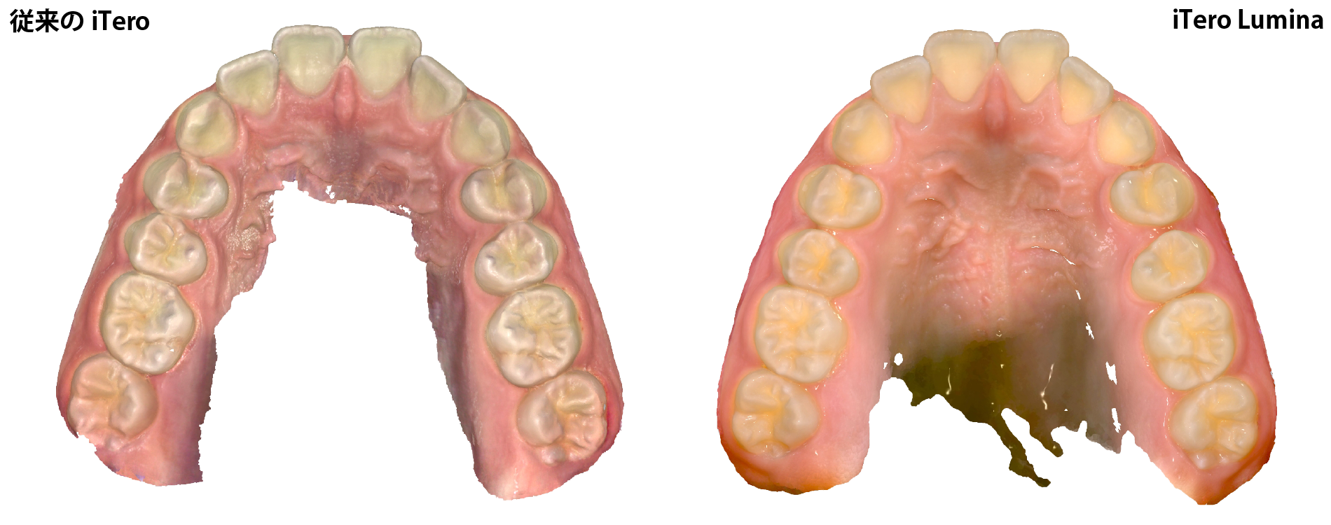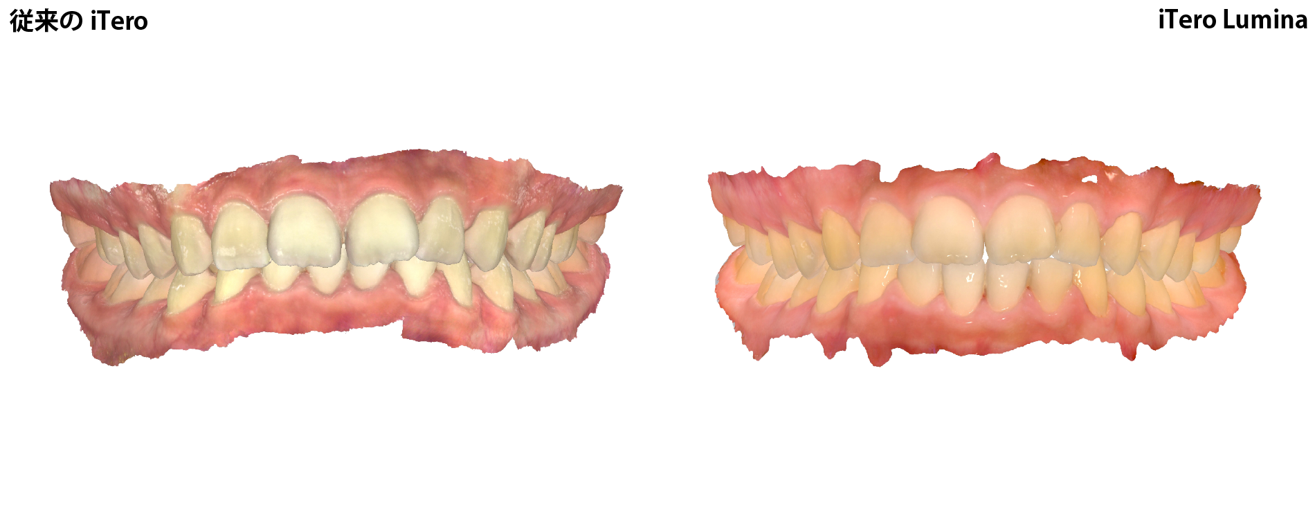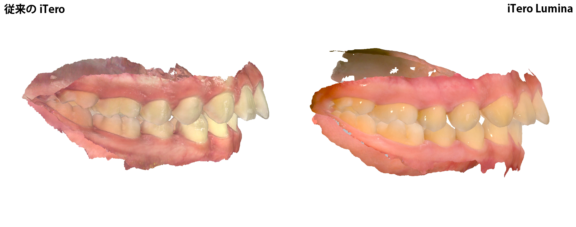 従来のiTero と iTero Lumina のスキャンデータ画像を比較すると明らかにその精細度に違いがあります。
