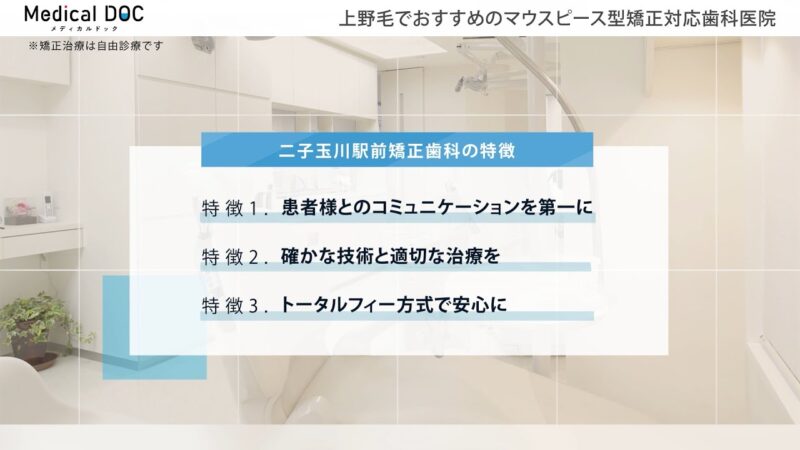 二子玉川の矯正歯科「二子玉川駅前矯正歯科」は、二子玉川駅から徒歩2分にある、矯正専門の矯正歯科(歯医者)です。土曜、日曜も診療しており、お仕事帰りの方でも通えるよう夜20時まで診療しています。個室カウンセリングルームもご用意しており安心してカウンセリングを受けられます。「iTeroエレメント5D PLUS」、「3Dスキャナー」「アウトカムシミュレーターによる無料シミュレーション」「クリンチェックソフトウェア」、「セファロレントゲン」なども完備。あらゆる歯列矯正治療に対応しています。短期で治療を終えるための「短期集中(スピード矯正)治療」、見えない「裏側矯正(舌側矯正)」や目立たない透明な「マウスピース矯正(インビザライン)」、「前歯だけの部分矯正(プチ矯正)」、「歯を抜かない矯正(非抜歯矯正)」、「小児矯正(子供の矯正)」、「後戻り改善矯正」、「ブライダル矯正プラン」、「就活矯正プラン」、痛みの少ない矯正治療、アンカースクリューを用いた矯正治療などがあります。相談無料、検査無料で、基本的にお求めやすい金額(安い・安価)で治療費を設定し、毎月の調節料や期間が延びても追加費用が発生しない治療費定額制となっています。治療費が高額で一歩を踏み出せない方、まずはご相談ください。デンタルローンによる分割払いやクレジットカード払いにも対応しています。世田谷区、二子玉川、用賀、桜新町、川崎市、狛江市、高津区、中原区などや、東京、神奈川、千葉、茨城、栃木、群馬、埼玉、関東全域、その他の県などの遠方からも、多くの患者様が来院される口コミ・評判・おすすめ・評価が高い人気の歯列矯正歯科です。