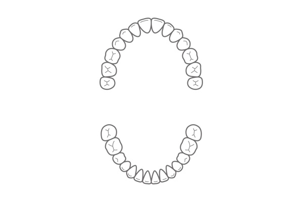 歯の本数は親知らずを除いて通常28本です。その上下14本ずつの歯が均等に噛んでおり、前歯の真ん中が体の中心にあり、歯がきれいに並んでいる状態が正しい歯並びです。