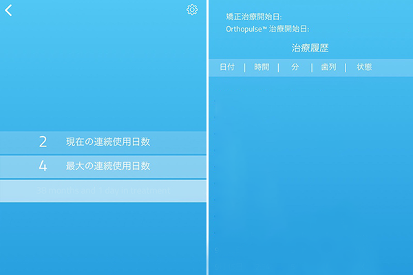 毎回使用後に、光加速矯正装置(オルソパルス)をケースに戻すだけでデータがアプリと同期され、使用状況の確認はもちろんのこと、マウスピースの交換時期を通知する機能も利用でき、矯正治療を全面的にサポートしてくれます。