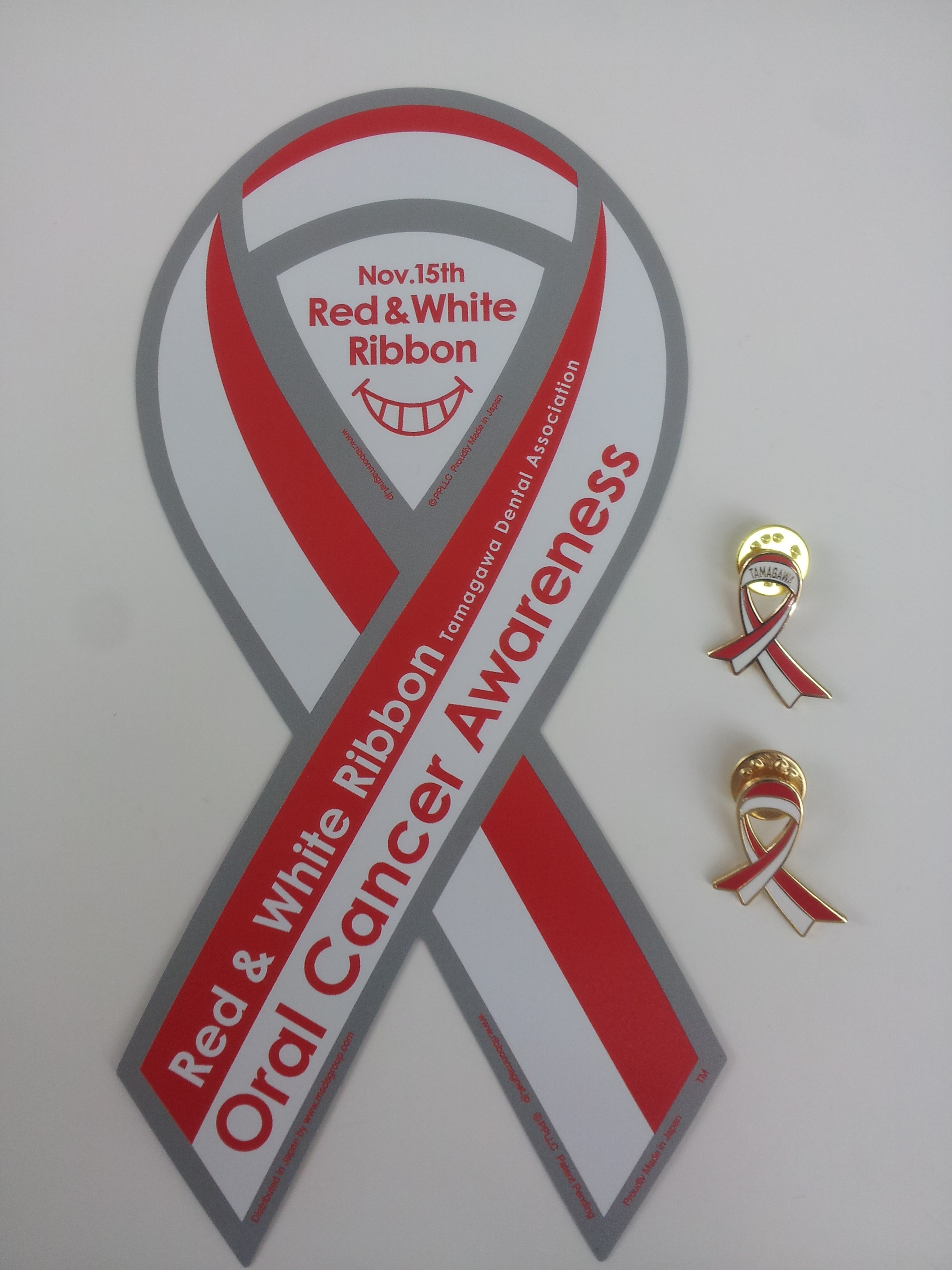 「口腔がん」の正しい知識と早期発見の大切さを多くの人に知ってもらい、「口腔がん」で悲しむ人がいなくなることを願って玉川歯科医師会が作製したバッジとステッカーです。