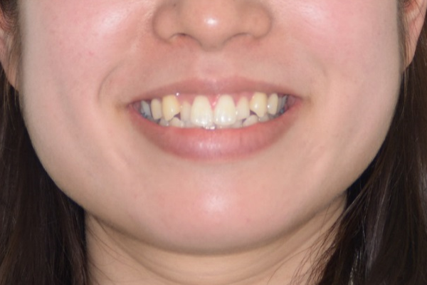 八重歯(犬歯突出)の治療では、叢生と同様、症状が重い方は、先に側方の歯を並べて前歯の並ぶスペースを作り、その後に前歯を並べるといったケースもあります。八重歯(犬歯突出)の治療では抜歯矯正になるケースも少なくありませんが、その際は、八重歯(犬歯突出)の方の多くは多数のむし歯治療をされていることが多いため、歯の神経を抜いていたり、大きな被せ物をしていたりする歯を優先的に選びます。またインプラント矯正を行うことで、非抜歯で治療を行うことも可能なケースもあります。治療期間は早い方で1年以内、通常は1.5~2.5年程度になります。